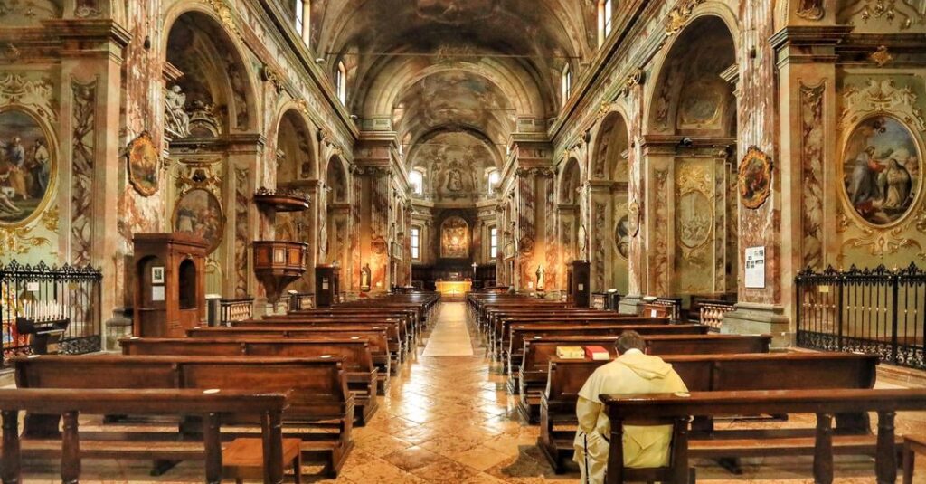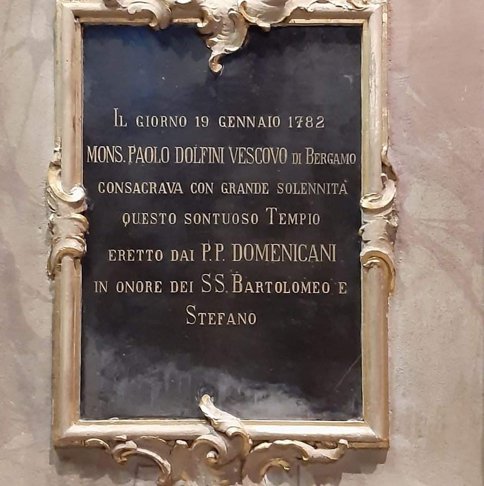 Al suo interno la Chiesa presenta importanti opere d’arte, come gli affreschi di Mattia Bortoloni e di Gaspare Diziani, opere del Picenardi, del Brena, di Enea Talpino detto il Salmeggia, del Coppella, del Ricchi detto il Lucchese, dell’Orelli, del Salis, del Discepoli detto lo Zoppo, del Facheris detto il Cavarsegno, del Damiani e dell’Anselmi; degni di nota sono gli intarsi lignei di fra’ Damiano Zimbelli e, naturalmente, la famosa “Pala del Martinengo” di Lorenzo Lotto.