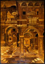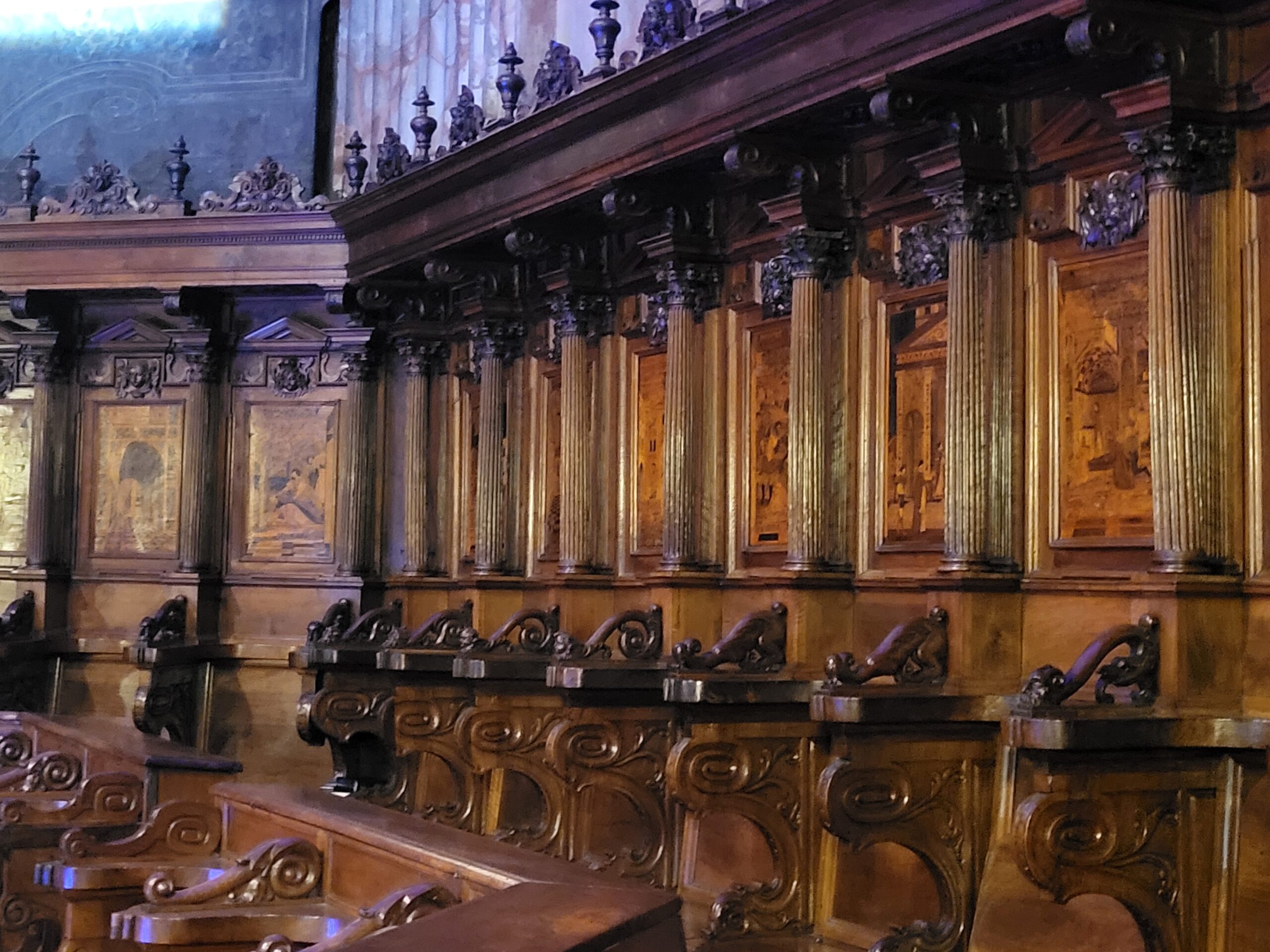 Le tarsie presenti nell’attuale coro sono quelle che fra Damiano Zambelli o.p. (1480 – 1549) eseguì per decorare il coro della chiesa domenicana di S. Stefano in Bergamo. Fra Damiano era un “esecutore”, nel senso che traduceva con legni intarsiati i cartoni o i disegni tracciati da pittori o architetti. È verosimile che nella esecuzione dell’opera fra Damiano abbia trovato un valido aiuto nei suoi due discepoli Giovanni Maria de Marendis e Giovanni Francesco Capoferri, almeno negli anni 1520 – 21. Verso il 1526 si trasferì a Bologna per le opere da farsi nel convento e nella chiesa di S. Domenico. Dalla distruzione di S. Stefano, effettuata con forsennata celerità, i frati poterono salvare ben poco per mancanza di tempo. Dopo 85 anni di traversie, di tutte le tarsie ne rimasero 31, le quali migrarono da S. Stefano al convento domenicano di S. Maria della Basella presso Urgnano (1561 – 1565); da qui a S. Bernardino in Bergamo (1565 – 1571) ed infine a San Bartolomeo. Nel 1647 le tarsie trovarono definitiva collocazione nel nuovo coro barocco. Nella sua vita fra Damiano realizzò, oltre alle tarsie di Bergamo, anche il magnifico coro della chiesa S. Domenico a Bologna e, come opera giovanile, il coro della chiesa domenicana di S. Giacomo a Soncino.